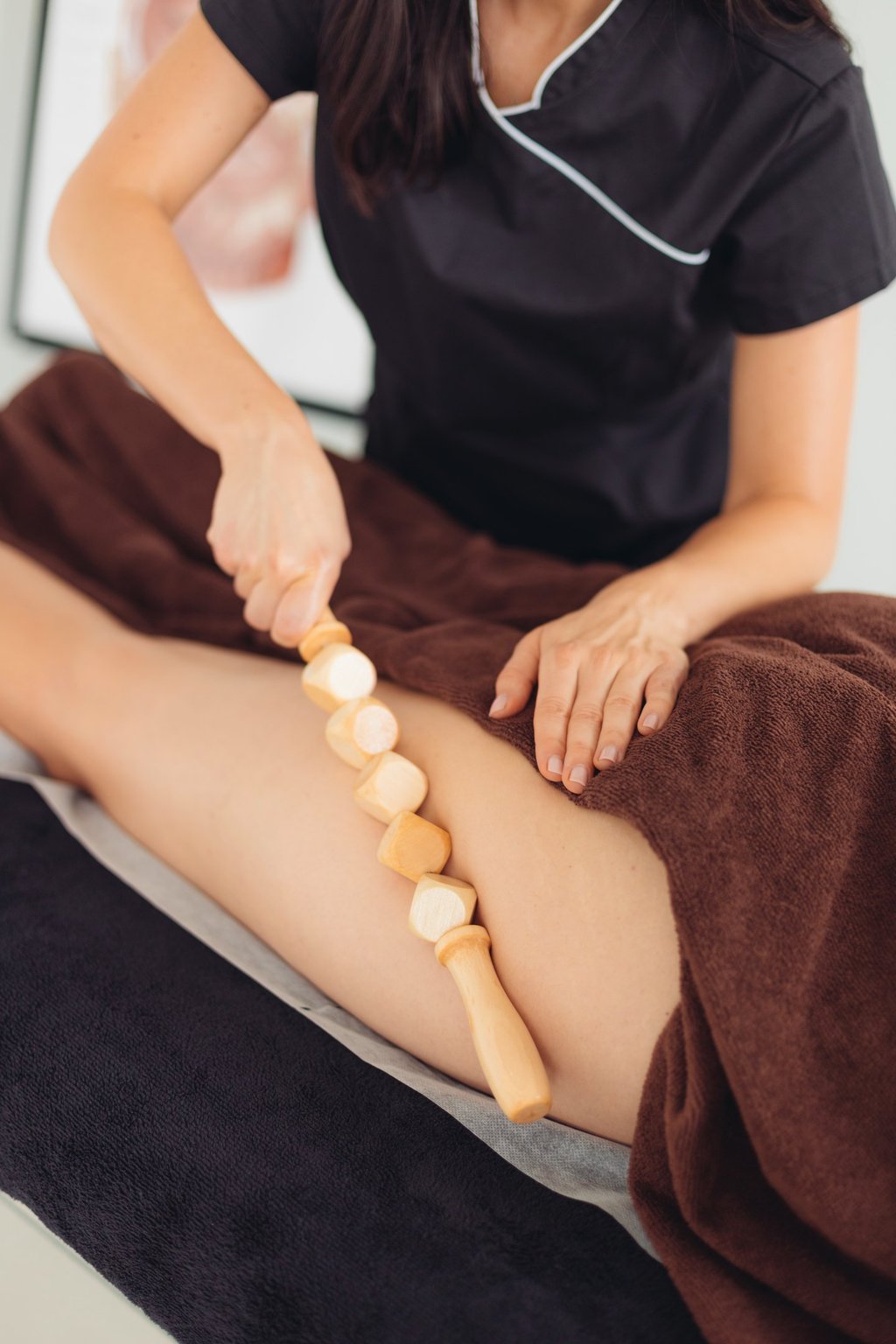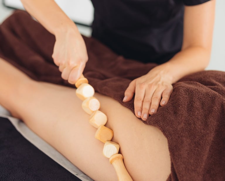 Masaje intenso de piernas y glúteos con herramientas de madera, ideal para reducir celulitis y mejorar la firmeza de la piel.