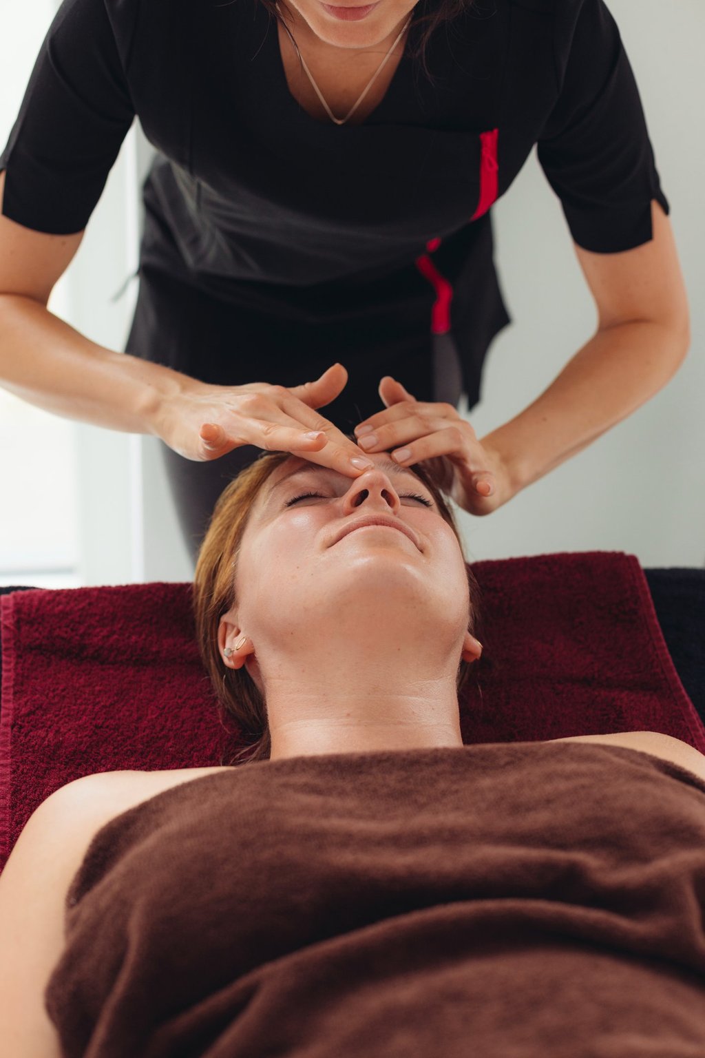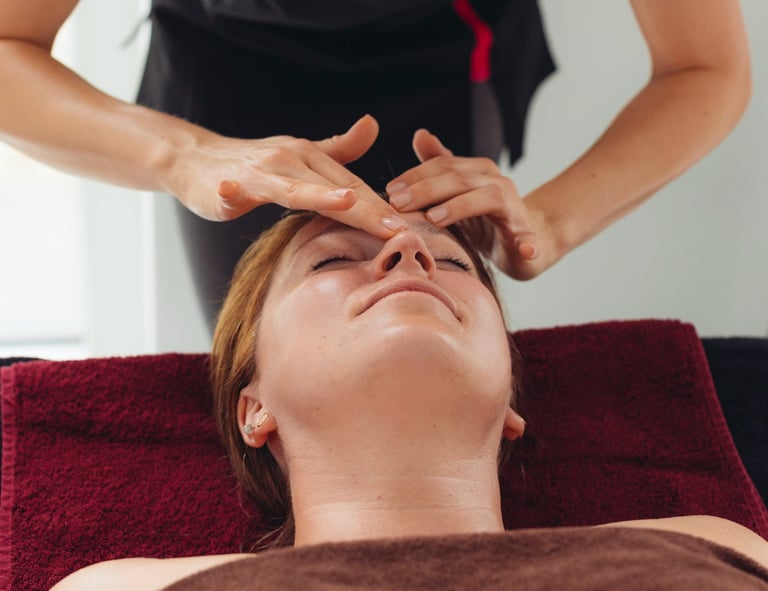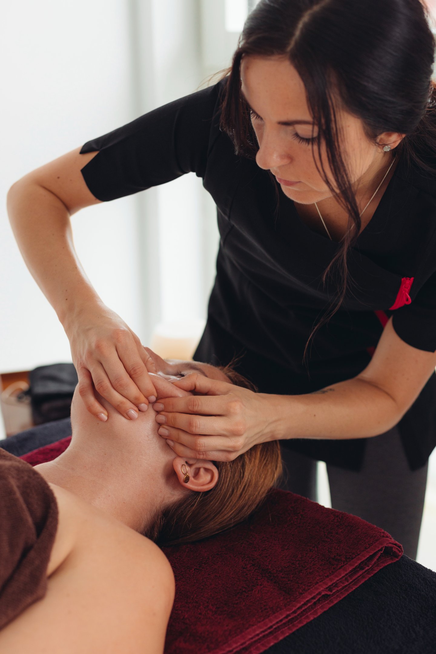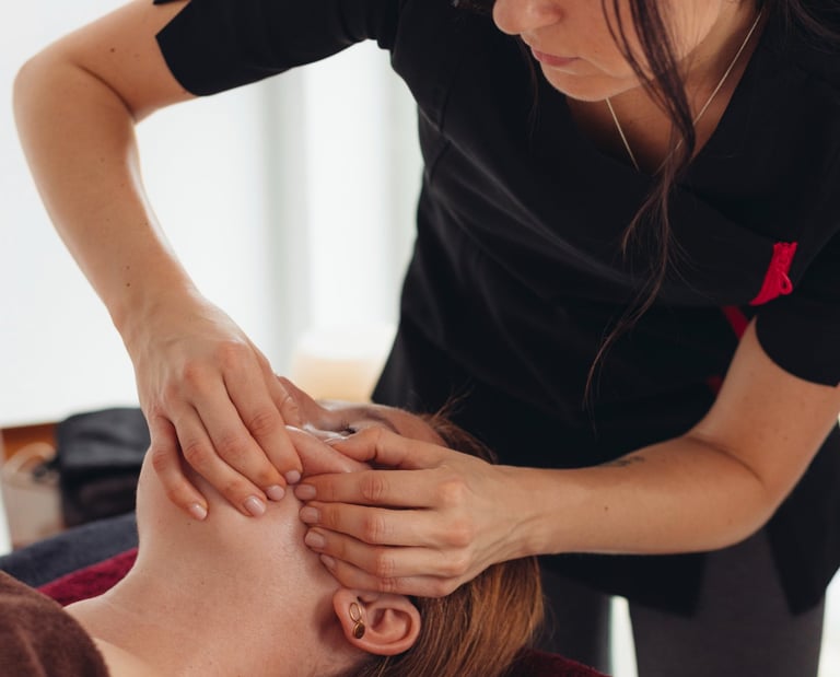 Masaje para liberar tensiones en hombros, cuello y músculos faciales.