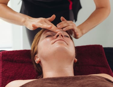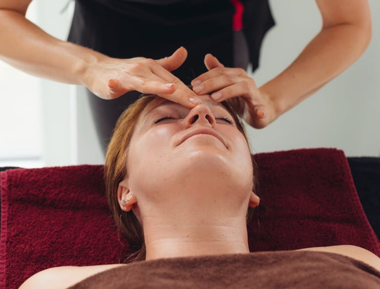 Masaż polegający na rozluźnieniu napięć w okolicy barków, szyi oraz mięśni twarzy.